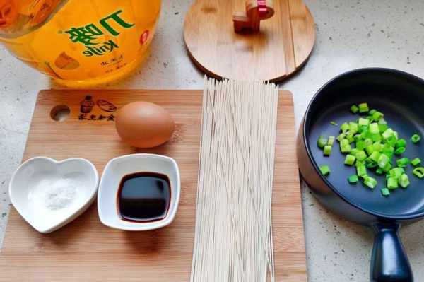 中裕麥芯掛面1小把、蔥花適量、醬油1湯匙、鹽1茶匙、雞蛋一個、玉米油適量、開水適量。