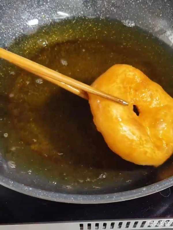 3、醒好的面用手揪一塊整理一下,中間用手搓一個小洞,一定要高油溫下鍋炸,五秒內迅速飄起,說明油溫剛剛好,炸至一面定型,翻過來炸另一面炸至兩面金黃酥脆就可以出鍋瞭。