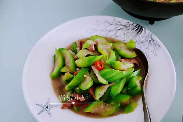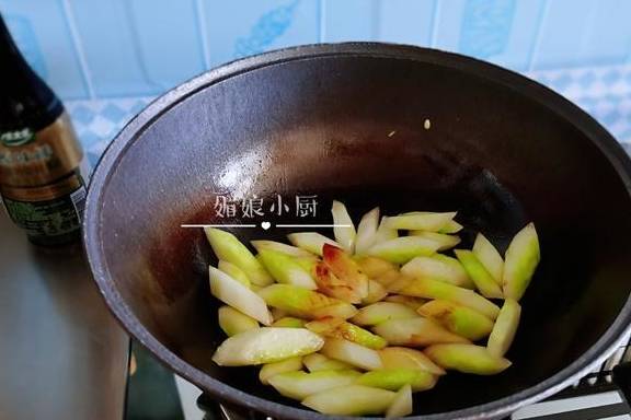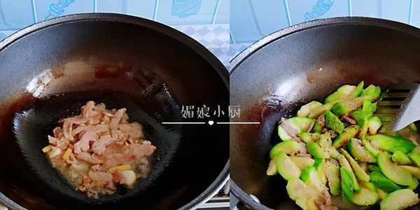 熱鍋加油,爆香薑蒜,下入肉片劃炒變色,加入絲瓜塊,大火快速翻炒,看絲瓜想要出水便可關火,然後再加適量鹽和黑胡椒翻拌均勻就好。