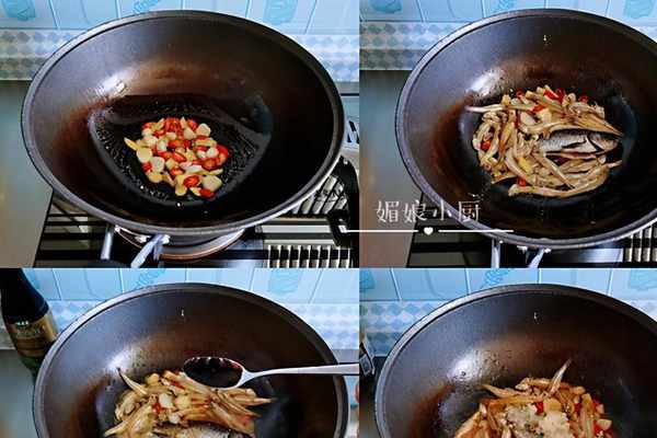 4.炒鍋洗凈重新熱鍋加油,下入薑蒜辣椒圈炒出香味,放入小魚幹炒幹水分,接著淋入2勺料酒去腥增香,再加1勺生抽,2勺甜酒釀(醪糟)炒勻