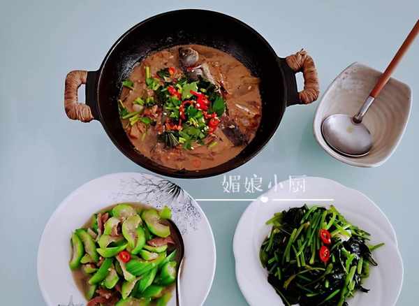 ▽小魚幹煮老黃瓜|絲瓜炒肉片|清炒紅薯葉