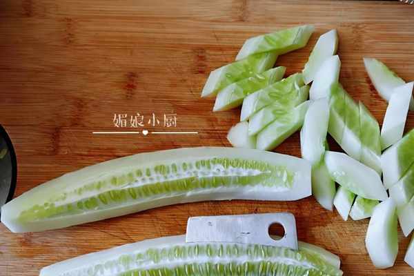 煮制的黃瓜我一般是喜歡刮去外皮後沖洗幹凈,也不用菜板,直接用刀削成滾刀小塊。這根白黃瓜有點老,裡面的籽已有些變硬,入鍋煮後瓜瓤容易散,瓜籽會影響食用,還是先給去除瞭更好些。