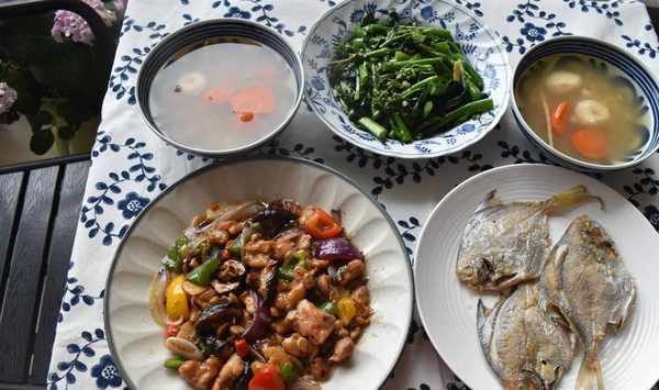 第四天晚餐有香煎白倉魚、香菇彩椒炒雞塊、胡蘿卜竹蔗茅根湯和薑蓉炒芥蘭。