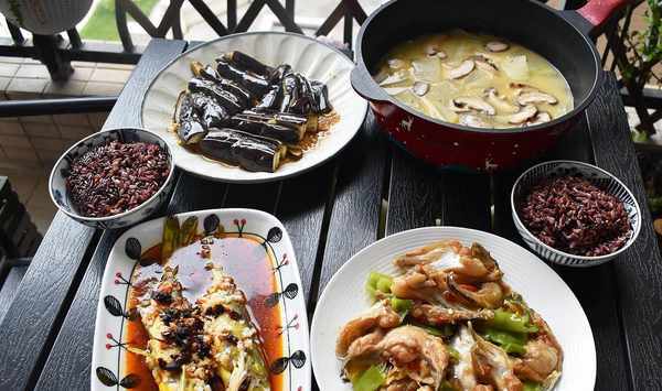 第六天晚餐有青椒炒魚鰭、豉汁蒸黃骨魚、菊花蒸茄子和香菇冬瓜咸蛋湯。