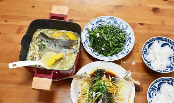 第一天晚餐有清蒸魚、玉米海鮮菇魚湯和蒜蓉炒青菜。