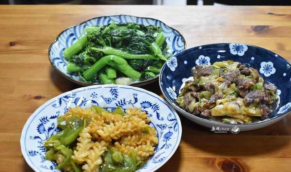 這頓晚餐3道菜都是快手傢常菜,準備好所有材料,30分鐘之內就能做好。炒鍋燒熱油,放入牛肉片爆炒幾下盛起。炒鍋放入大蔥爆炒,大蔥炒軟後放入牛肉一起炒,加入生抽、料酒、少許砂糖炒勻即可。