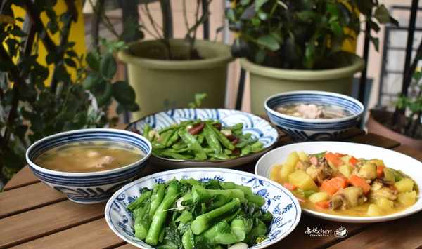 第五天晚餐有土豆咖喱雞、荷蘭豆炒臘腸、炒菜心和淮山蓮子排骨湯。這頓晚餐用淮山、蓮子、薏米和排骨煮湯,夏天多喝點湯水補充水分和營養。