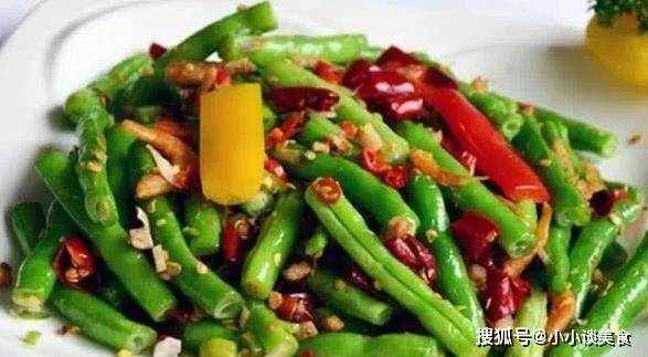 5、倒入切碎的豆角,大火翻炒3分鐘至豆角變軟,加入一勺鹽調味,攪拌均勻。