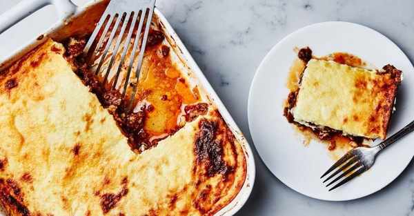 地中海和巴爾幹半島都能瞧見做法各異的 moussaka,其中經典的希臘版本是以清炒茄子、絞肉炒西紅柿泥、洋蔥、大蒜、肉桂和多香果等香料、些許馬鈴薯層層堆棧,最後淋上貝夏美白醬並撒上起司而成。