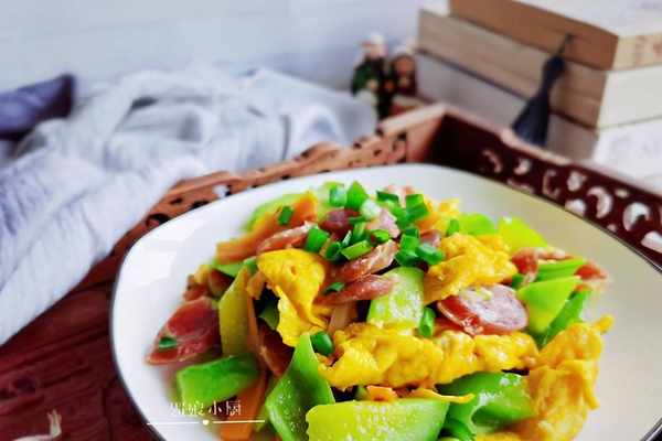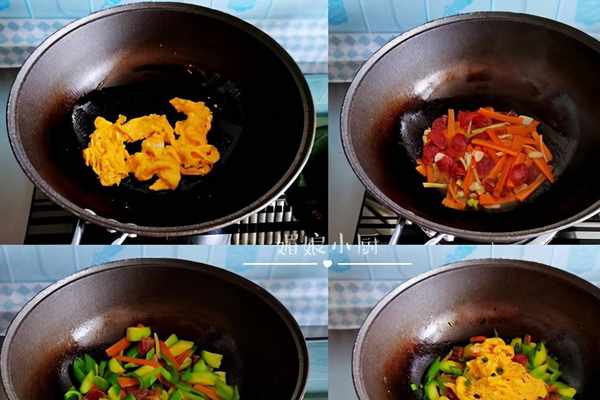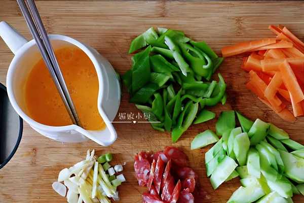 把要用到的食材一次性準備好,再下鍋快炒,前後花不瞭10分鐘就可端上桌。青椒1個洗凈去蒂去籽切菱形片,黃瓜去皮洗後斜切半厘米厚的小塊,胡蘿卜、香腸切片,雞蛋2個加1湯匙料酒打勻蛋液