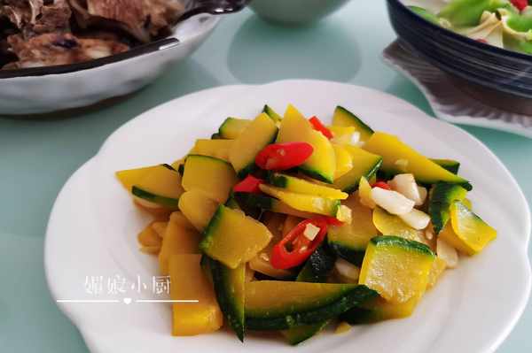 這是老傢味的小炒菜,小時候母親常做,香辣開胃飽腹。熱鍋加油爆香蒜和辣椒,下入南瓜片翻炒幾下,淋入少量開水,蓋上鍋蓋燜3--4分鐘,加鹽炒勻即可。
