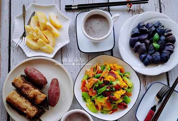 早餐要吃得豐富,但做法卻要簡單快手省時。我常是將幾樣主食一鍋裡蒸煮,這樣可以多樣化粗細搭配。紫土豆刷洗幹凈放入煮鍋裡,加足量的清水,上面架蒸屜,放入紅薯,粽子,大火燒鍋裡沸騰,中火蒸煮15分鐘,土豆和紅薯蒸熟即可。