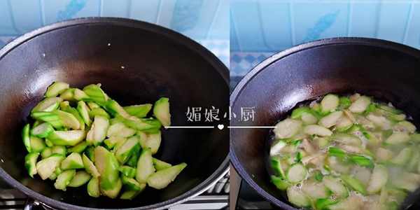 2、熱鍋加油爆香薑絲,下入絲瓜塊翻炒1分鐘,接著倒入排骨湯