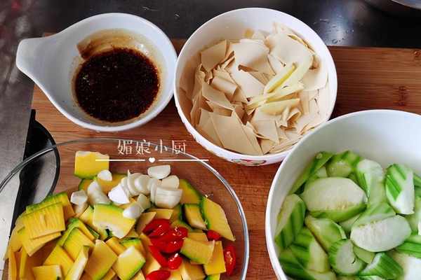 絲瓜2根去皮清洗削成滾刀小塊,加鹽拌勻防止顏色變黑,豆皮先切成長條再切成菱形片,南瓜洗凈去瓤切片,蒜切片小米辣切圈,薑切絲