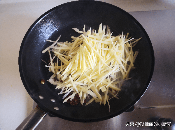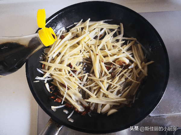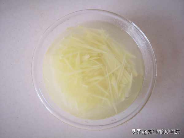 制作:1.將切好的土豆絲放入浸泡一下後再用流水沖洗一下,這樣是為瞭去除土豆中的大部分淀粉,保持土豆爽脆的口感;