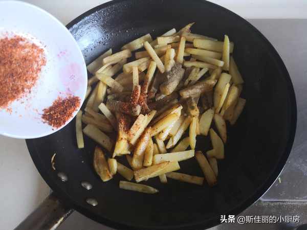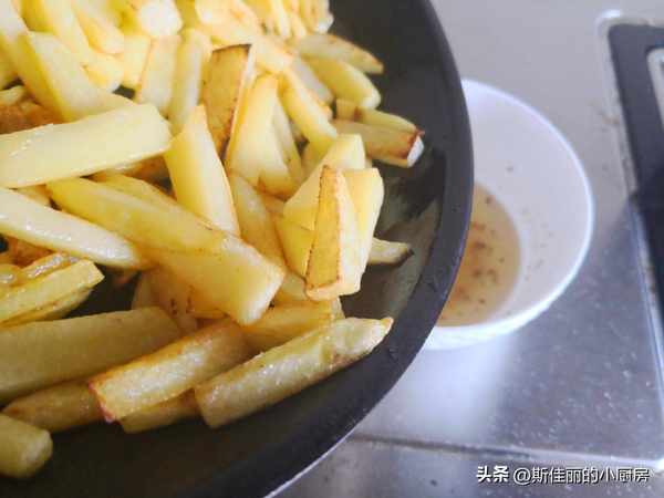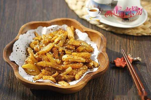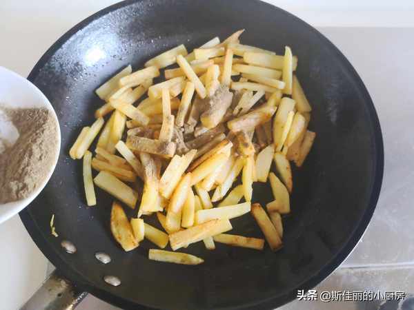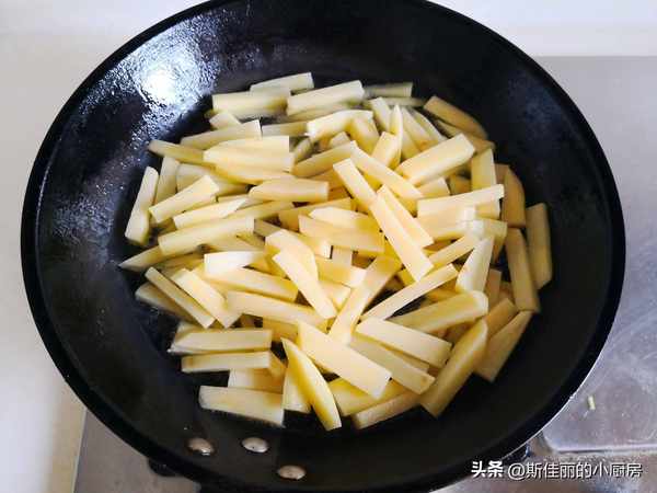 制作:1. 將鍋中倒入比平時炒菜多一點的油,加入浸泡過的土豆條入鍋小火慢慢煸炒; 不停的煸炒直至土豆條表面微微發焦;