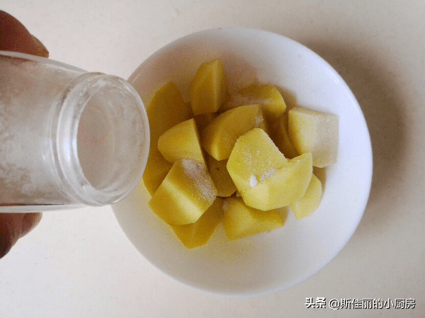 制作:1. 將土豆塊加入少許鹽拌均勻醃制一下;