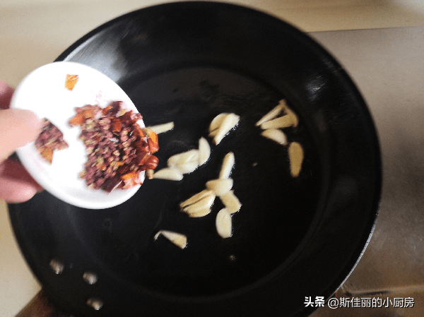 2 熱鍋涼油,將蒜瓣、幹辣椒圈、花椒等大量進鍋煸炒香;