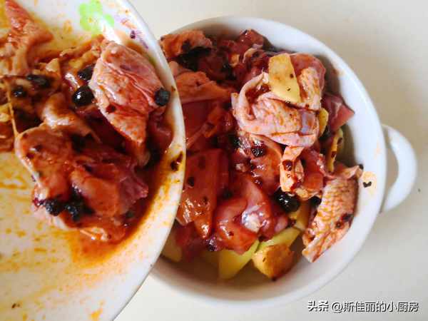 2. 雞腿塊加入少許鹽、料酒、薑片等調味料拌均勻,再將香辣豆豉醬放入土豆塊後拌均勻繼續醃制一下;