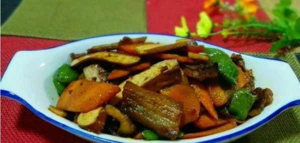 8、放入胡蘿卜、青椒、鹽翻炒,翻炒後加入少許水,翻炒至胡蘿卜熟透,即可入鍋。
