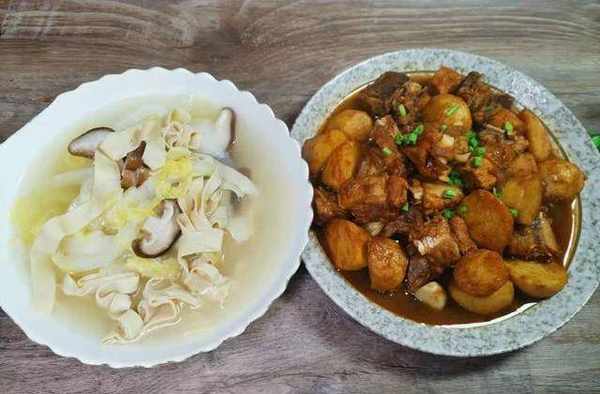 第五天:香菇白菜燒豆皮+芋頭燒排骨——有葷有素,有粗糧也有菌菇,兩道菜肴也可以吃得很香。