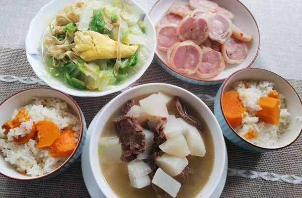 第七天:白菜雞蛋燒豆皮+捆蹄+蘿卜牛肉湯+紅薯米飯——有紅薯、牛肉、豆制品、雞蛋、蔬菜,有湯有菜。