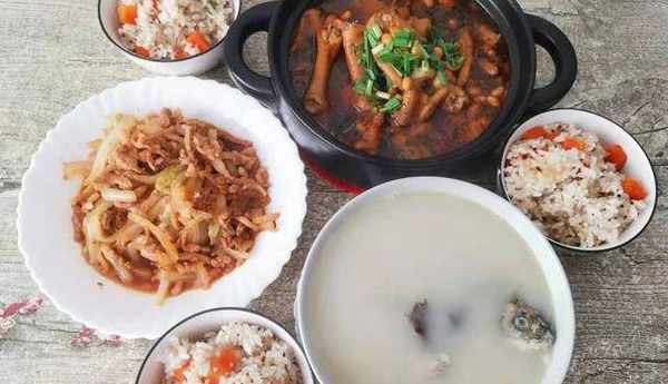 第二天:鯽魚豆腐湯+白菜炒肉絲+黃豆燜雞爪——兩菜一湯,有肉有魚,也有下飯菜,米飯中也有藜麥與胡蘿卜,粗細搭配,營養豐富。