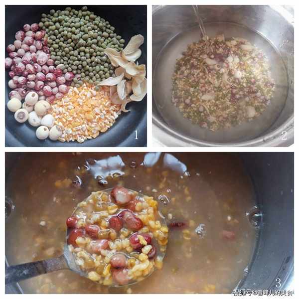 玉米蓮子百合粥的做法:材料:玉米碴子,蓮子,百合,花豇豆,綠豆。