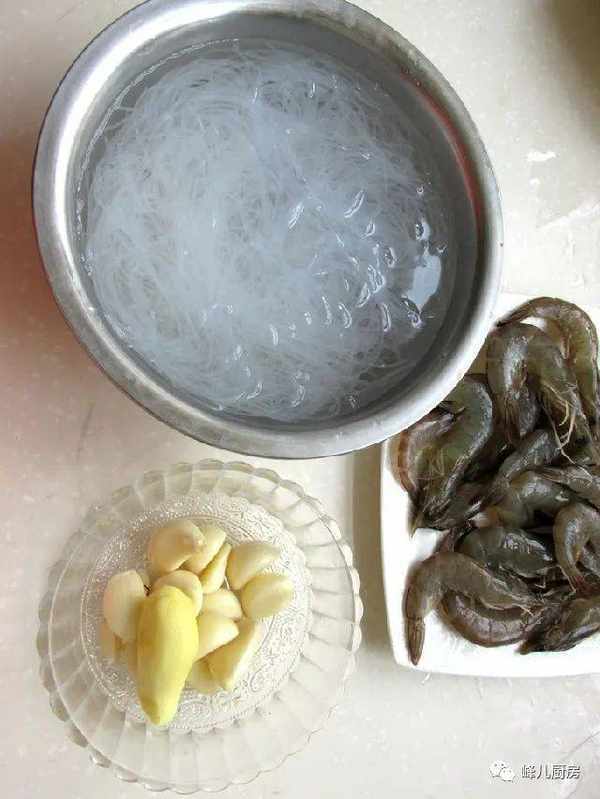 材料。海蝦,大蒜,粉絲,薑,生抽,糖,鹽,菜籽油。