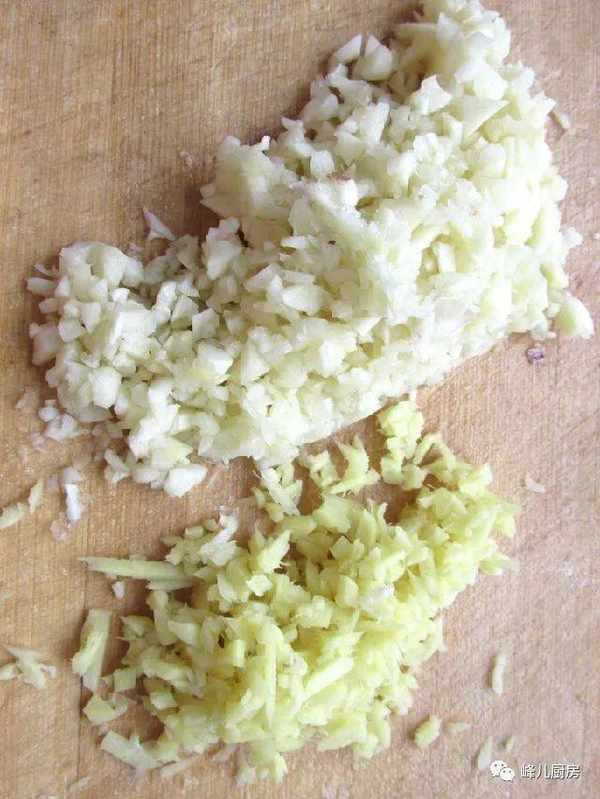 2、把大蒜剁成蒜末,薑切末,如果孩子不喜歡吃,可以放料酒代替薑末。