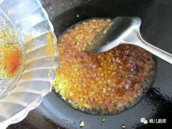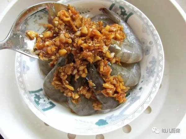 9、把蝦擺在上面,用勺子把炒好的蒜末,舀在蝦的上面。