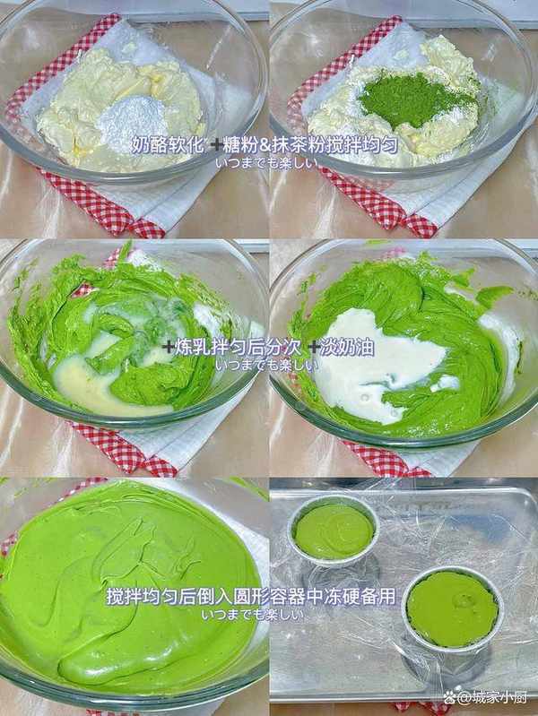奶油奶酪400g,糖粉30g,煉乳,60g,抹茶粉16g,淡奶油300g。奶酪軟化+糖和抹茶粉拌勻+煉乳拌勻後,分3次加奶油攪拌均勻,擠入圓底的容器中凍硬。