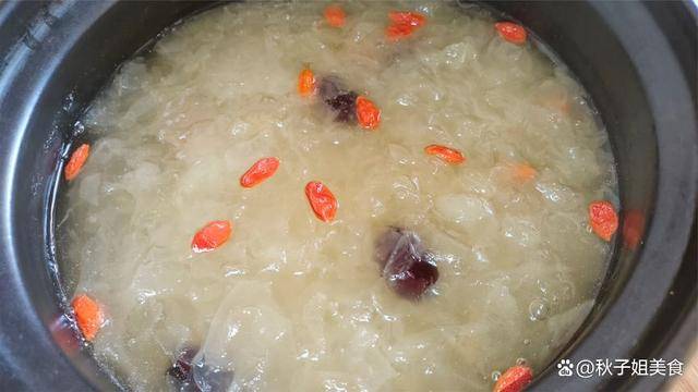 2、然後用筷子不停的攪拌,這樣能快速出膠,再把大棗,一把冰糖攪拌化開,然後再轉小火,煮到40分鐘,再來一把枸杞,攪拌均勻就可以出鍋瞭,銀耳羹就做好瞭。