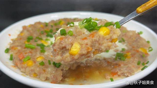 2、把肉末倒入盤子裡鋪放平整,在肉末中間打入兩個雞蛋,把肉餅放入蒸鍋,水開後蒸12分鐘後,再淋上蒸魚豉油,撒上蔥花。蓮藕蒸肉餅就好瞭。