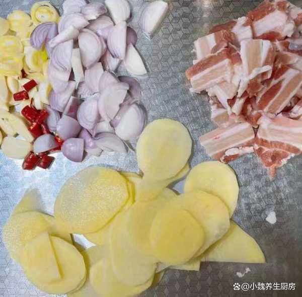 食材選購:選購320克黃心大土豆(土豆是我們日常生活中的蔬菜之一,價格非常便宜,土豆的淀粉含量高,非常適合燉或者炒著吃,土豆非常清甜脆口,可以與很多食材搭配吃),新鮮五花肉200克左右(五花肉是豬肉的部位之一,五花肉看起來肥膩,吃起來特別香),小洋蔥2個,若幹個大蒜頭,適量橄欖油,幾個幹辣椒,半勺料酒,半勺老抽,味極鮮半勺,孜然粉少許,幾片生薑,其他調味品。
