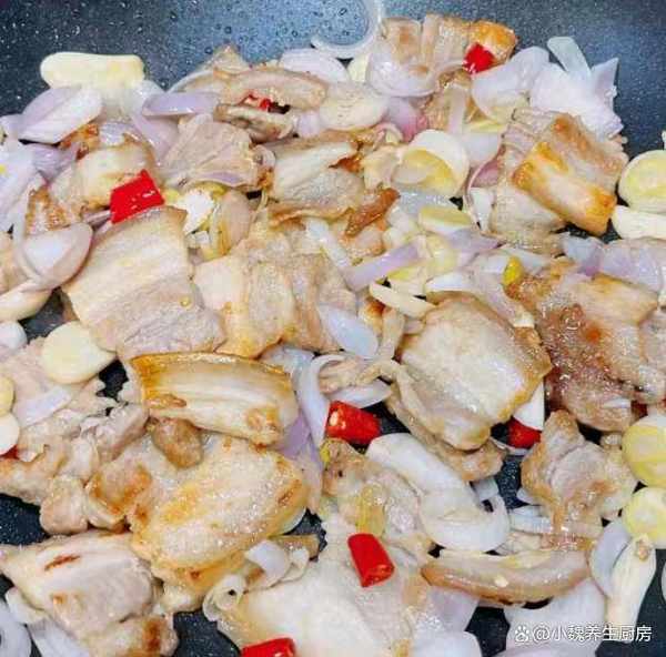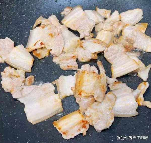 第四步:另外起鍋加上橄欖油,將油溫燒到8成熱,倒入醃制好的五花肉,慢慢小火煎一會兒,將肥油都炒出來,迅速翻炒均勻。