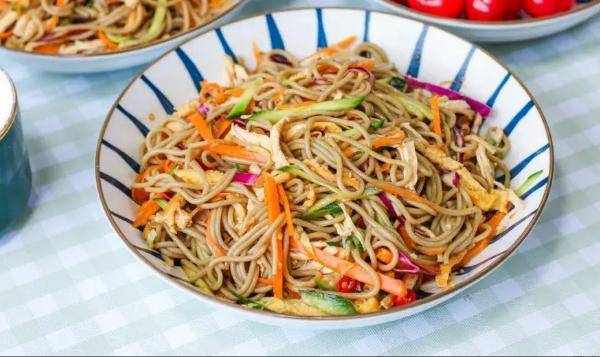 4.蕎麥面先泡15分鐘,水開煮3分鐘,出鍋裝盤加入黃瓜絲,胡蘿卜絲,紫甘藍絲,雞胸肉。倒入料汁攪拌均勻。營養又美味。