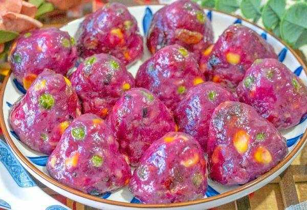 食材:500克雜糧飯、250克紫薯、100克紅棗、300克豌豆、500玉米粒、50克葡萄幹、250克糯米粉