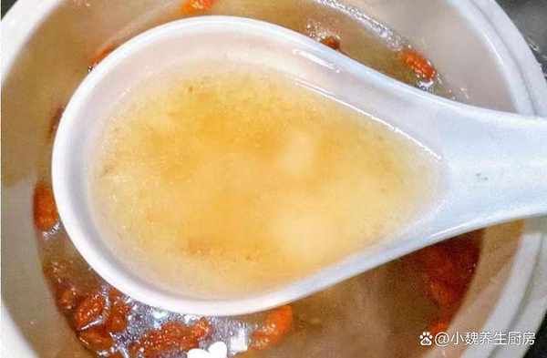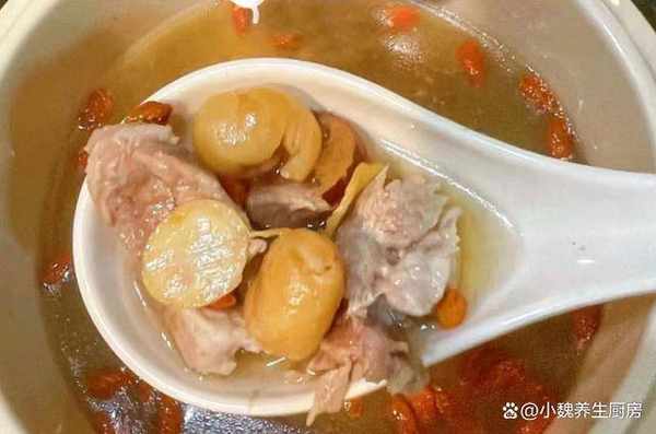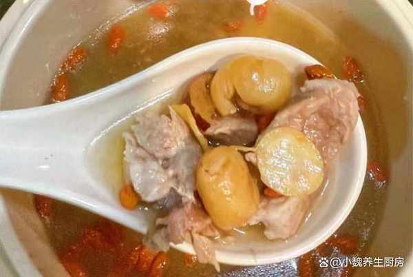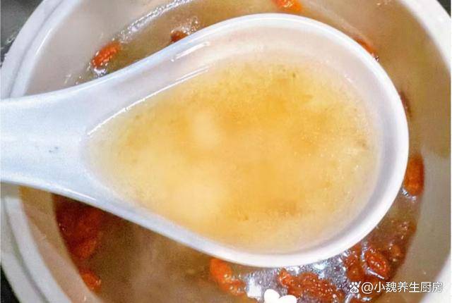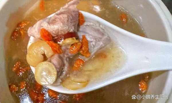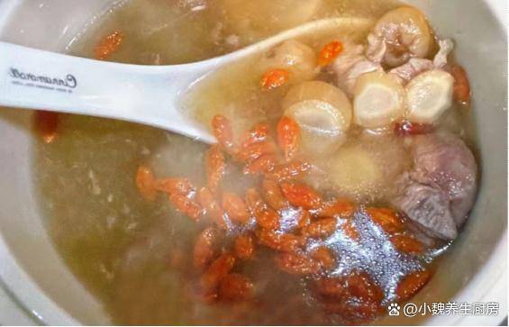 第五步:繼續轉小火燉煮一個小時,讓瘦肉燉至軟爛,最後丟入一些枸杞子,出鍋前加上少許食鹽,加上半勺胡椒粉,用勺子迅速攪動,燉煮一小會兒,關火出鍋,這道西洋參桂圓瘦肉湯就烹飪完成瞭。