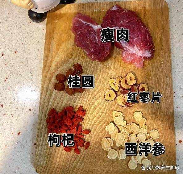 準備一些食材:選購西洋參45克左右(西洋參是一種很常見的中藥材,為寒補之品,補氣活血,增強抵抗力,平常可以用來燉湯,湯汁非常好喝,營養更鮮美,調理好我們的氣色),幹桂圓50克左右,選購新鮮精瘦肉300克左右(精瘦肉包括梅花肉或裡脊肉,肉質非常鮮嫩,其實也可以用來煲湯),紅棗幾個,溫水少許,純凈水少許,20克優質枸杞子,少許料酒,一小塊生薑,食鹽和胡椒粉若幹,其他佐料。