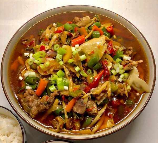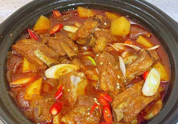 2、倒入土豆和年糕配菜,小火燉15分鐘後,撒入大蔥小米辣關火即可