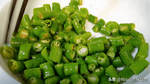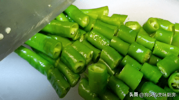 1.準備一把線椒,清洗幹凈,用刀去掉根蒂,再把它切成小段。