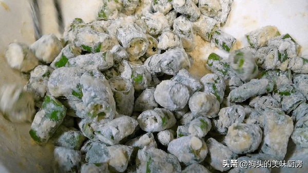 3.接著往裡面倒入適量的脆炸粉或者炸肉粉。攪拌均勻,讓每段線椒都裹上均勻的粉末。
