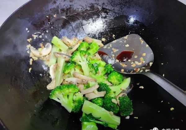 5.將焯水後的西藍花倒入鍋裡面,經過後焯水的西藍花更容易煮熟,所以下鍋後我們直接加入適量的食鹽跟蠔油調味,鏟子將它們炒均勻即可出鍋食用。