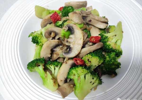 口蘑,西藍花,蒜瓣,食鹽,蠔油,食用油,再來一點幹辣椒提色