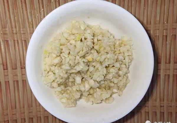 3.蒜弄成一小瓣,處理好的蒜放在水中洗凈,然後放在案板上一拍,直接將蒜皮剝開,裡面的潔白的蒜瓣都掉露出來瞭,用刀剁成泥,處理好放碗中備用;