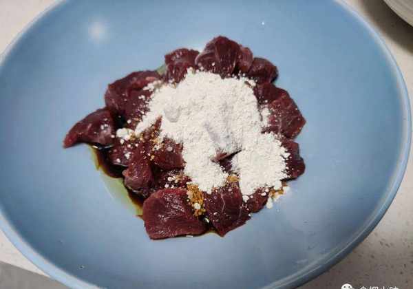 牛肉洗凈,洗凈後牛肉放在案板上,沿著它的紋路反向切開,也就是跟紋路成十字刀型切。切好後的牛肉再改刀切成細丁狀,加入淀粉,醬油,食用油,用手抓勻放在一旁備用;