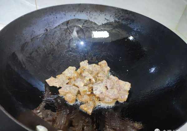 4.炒鍋中的水分幹後,倒入適量的油,油要稍微多一點,然後將醃好的牛肉丁下鍋用小火快炒。下鍋後鏟子要勤翻動,這樣子炒牛肉,鮮美好吃;