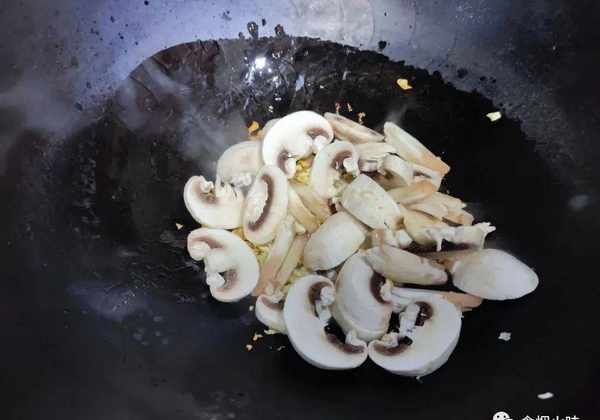 5.鍋中水分幹後倒入適量的油,油熱後,晃動鍋身,用熱油潤鍋,隨後將蒜泥倒入裡面用小火煸炒,蒜泥下鍋後一定要用小火,再將切好後的蘑菇倒入鍋內。鏟子翻炒,炒均勻;