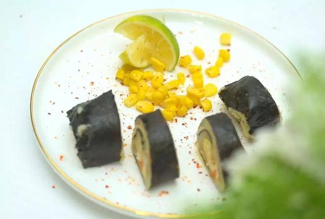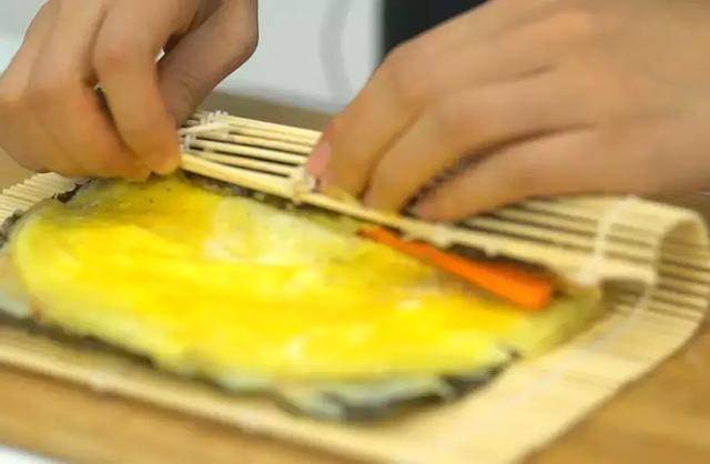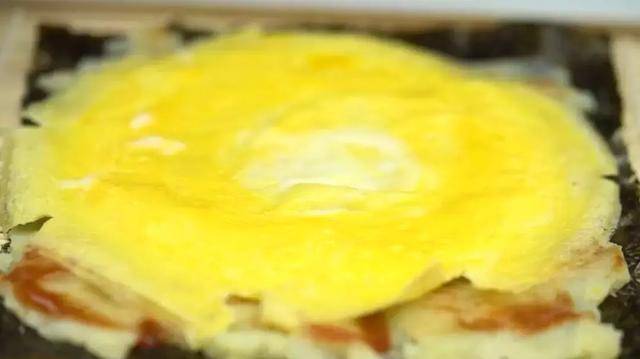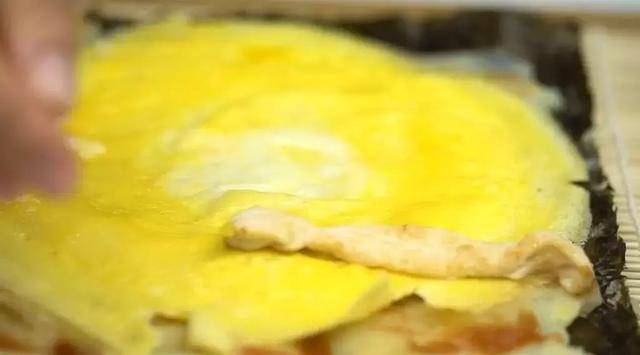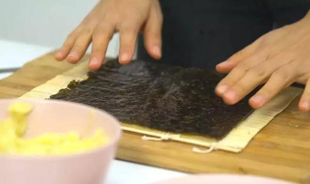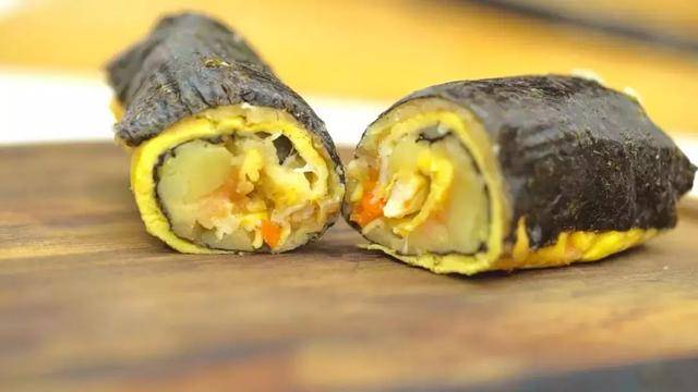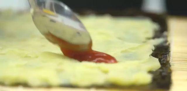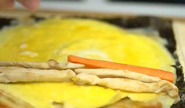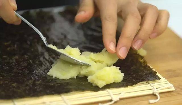 土豆蒸好瞭,壓成泥,土豆泥放涼才能做土豆泥壽司,放入一張海苔,放入土豆泥,土豆泥鋪好後,放入一點番茄醬,在上面放上雞蛋餅,放入雞身材肉,胡蘿卜,將壽司卷起來